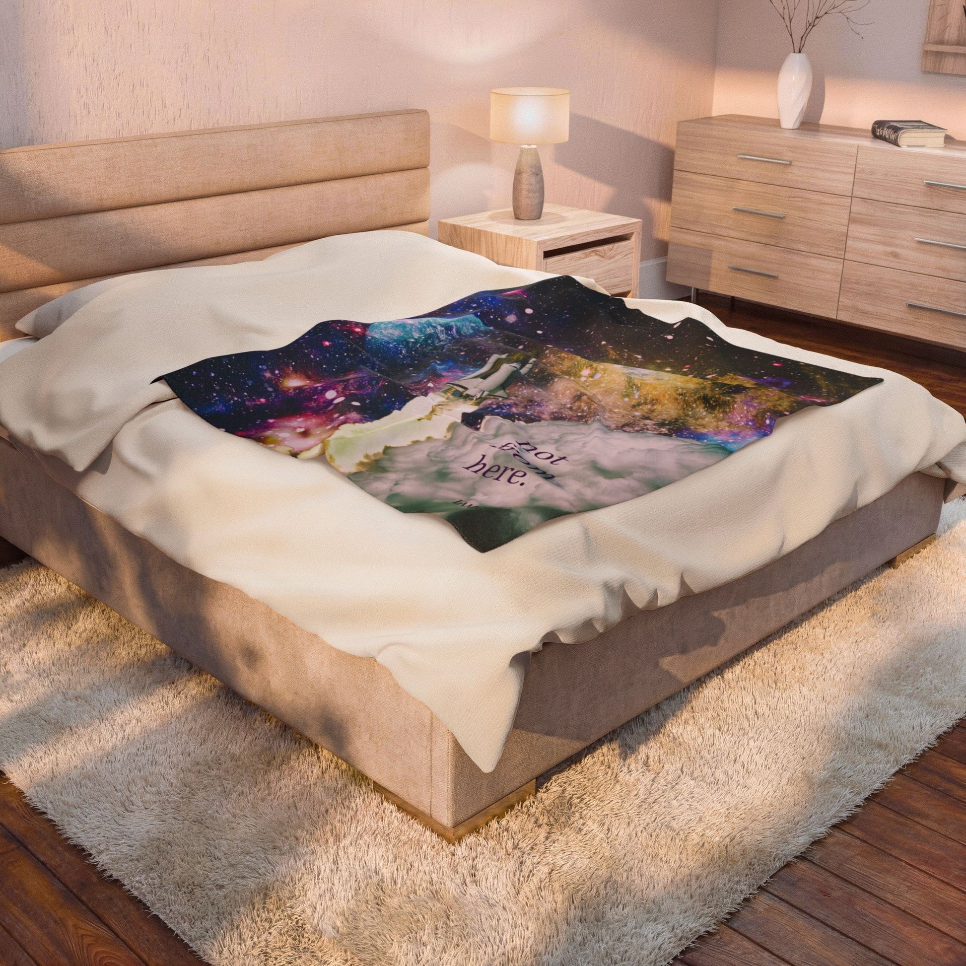 Crafted from velvety plush fabric, this blanket feels lush against your skin while offering a medium-heavy weight that drapes perfectly without feeling bulky. Whether you’re curled up journaling, watching something inspiring, or simply letting your mind wander beyond this dimension, it’s designed to hold you in comfort while your creativity runs wild.